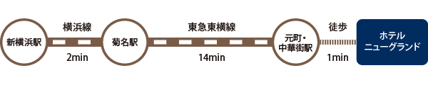 新横浜駅→(横浜線 東神奈川行)→菊名駅→(東急東横線 元町・中華街行)→元町・中華街駅