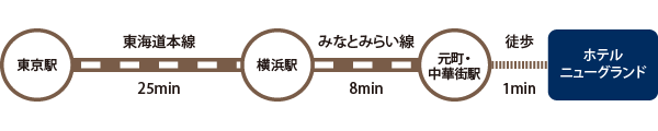 東京駅→(東海道本線 熱海行)→横浜駅→(横浜高速鉄道みなとみらい線 元町・中華街行)→元町・中華街駅