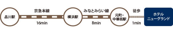 品川駅→(京急本線 三崎口行)→横浜駅→(横浜高速鉄道みなとみらい線 元町・中華街行)→元町・中華街駅