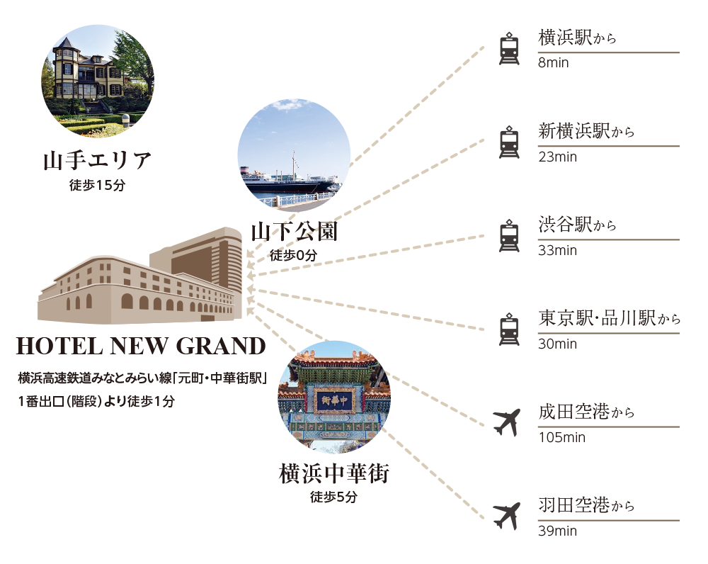 元町・中華街駅 1番出口(階段)より徒歩1分。2番出口(エレベーター)より徒歩2分でホテルに到着いたします。