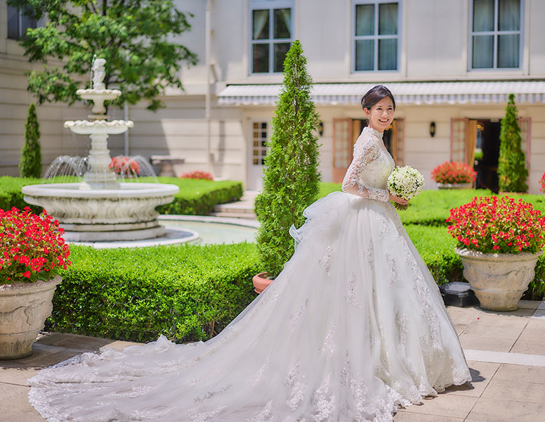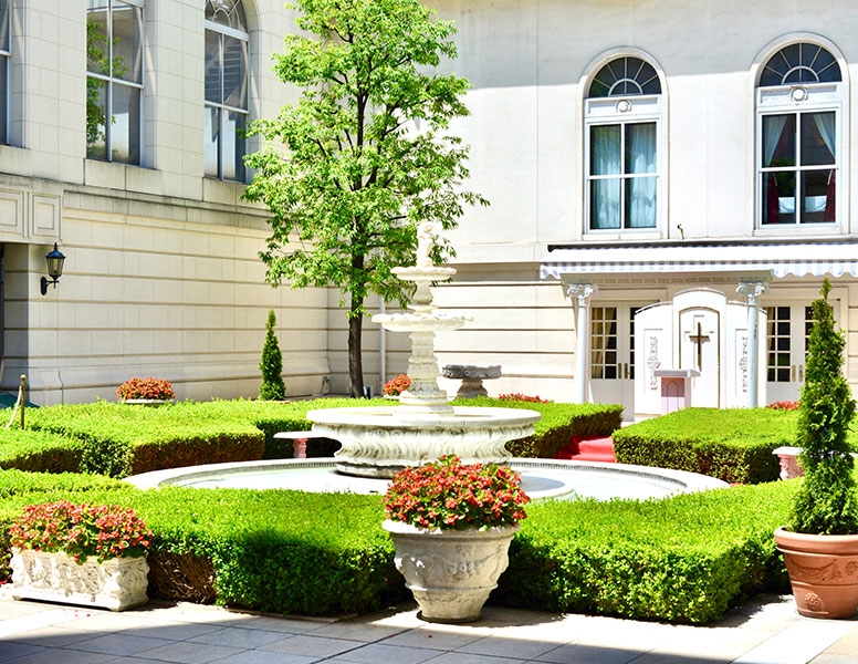 噴水のまわりには緑が映え、赤いバージンロードが際立ちます。
