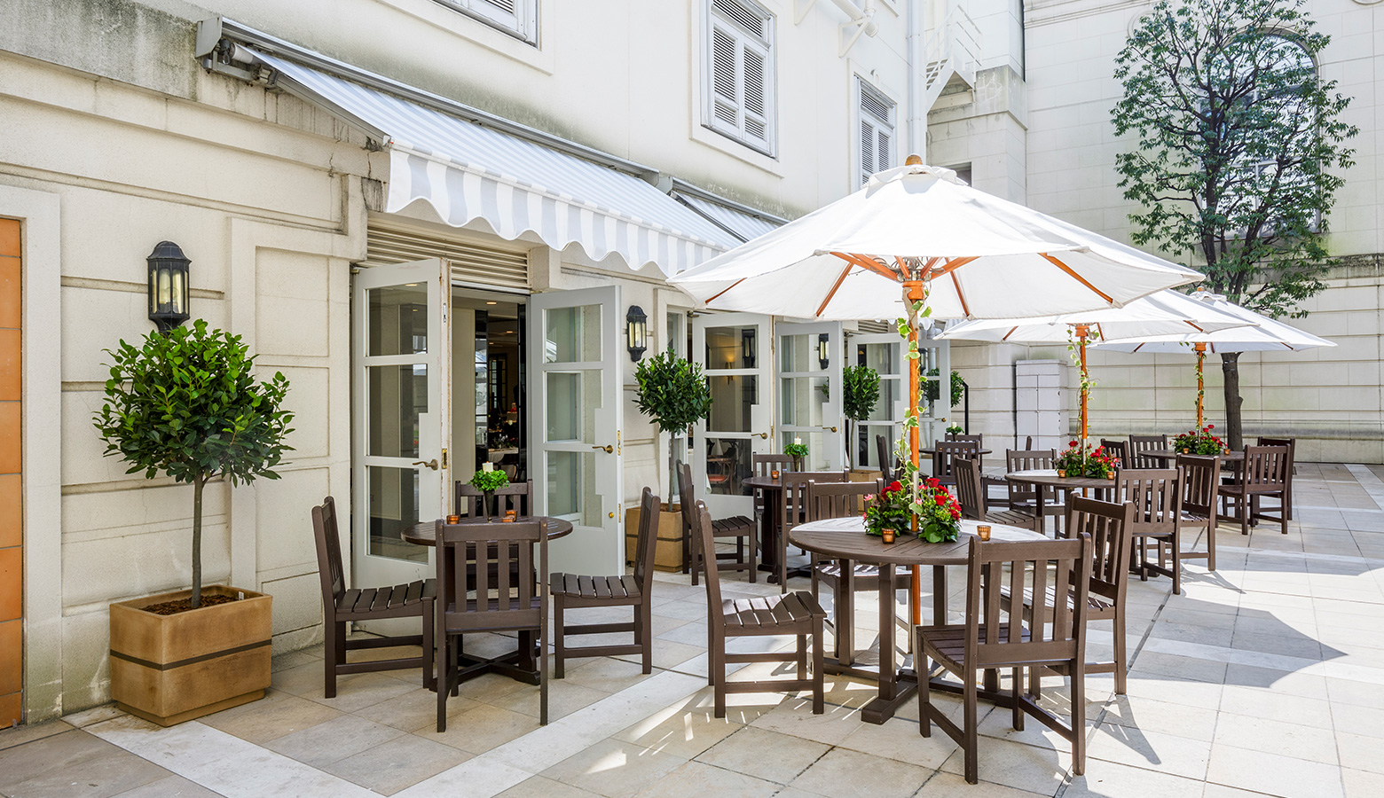 噴水を囲む花と緑が広がるパティオに