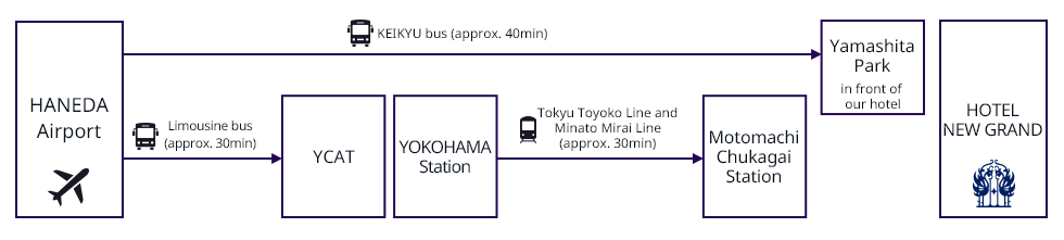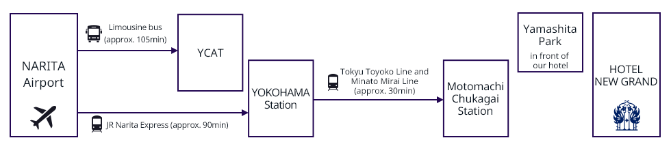 Shin-Yokohama Stn. - (JR Yokohama Line approx. 2 min.) - Kikuna Stn. - (Tokyu Toyoko Line and Minato Mirai Line approx. 15 min.) - Motomachi-Chukagai Stn.