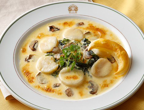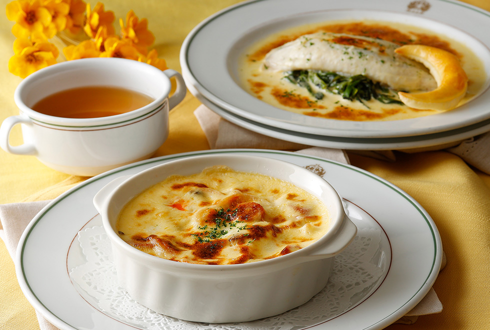 *トマトスパゲッティグラタン ¥3,542 *帆立のグラタン ¥6,072 *ソールフロランタン ¥6,072 *鶏のプリンスオルロフ風 ¥6,325 ※スープ、デザート、コーヒー付 |