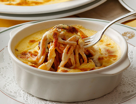 チョリソとモッツァレラチーズを入れたナポリタンをグラタン仕立てにした「トマトスパゲティグラタン」をはじめ、鶏肉や帆立、舌平目などそれぞれの旨味を活かしたオリジナルグラタンをご提供いたします。