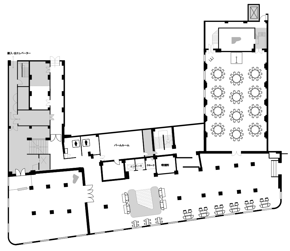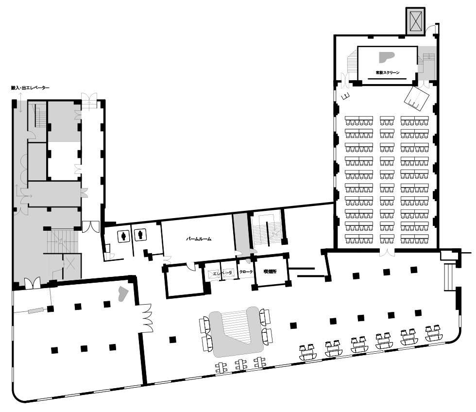 | 会場名 | ディナー (正餐) | ブッフェ (立食) | シアター (椅子席のみ) | スクール (学校形式) | 面積 |