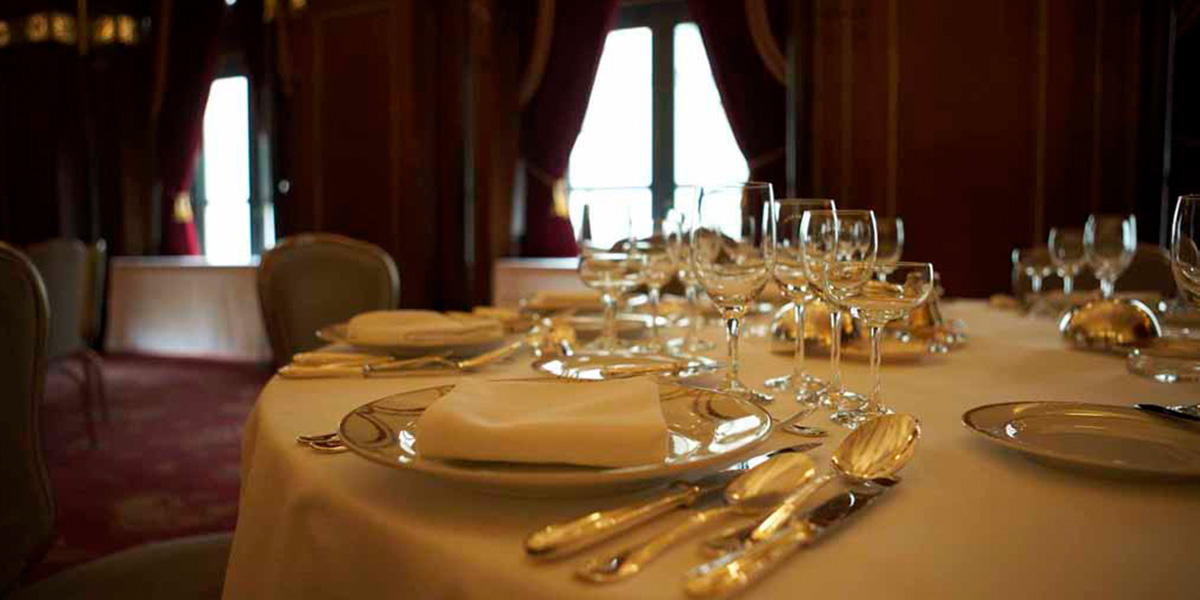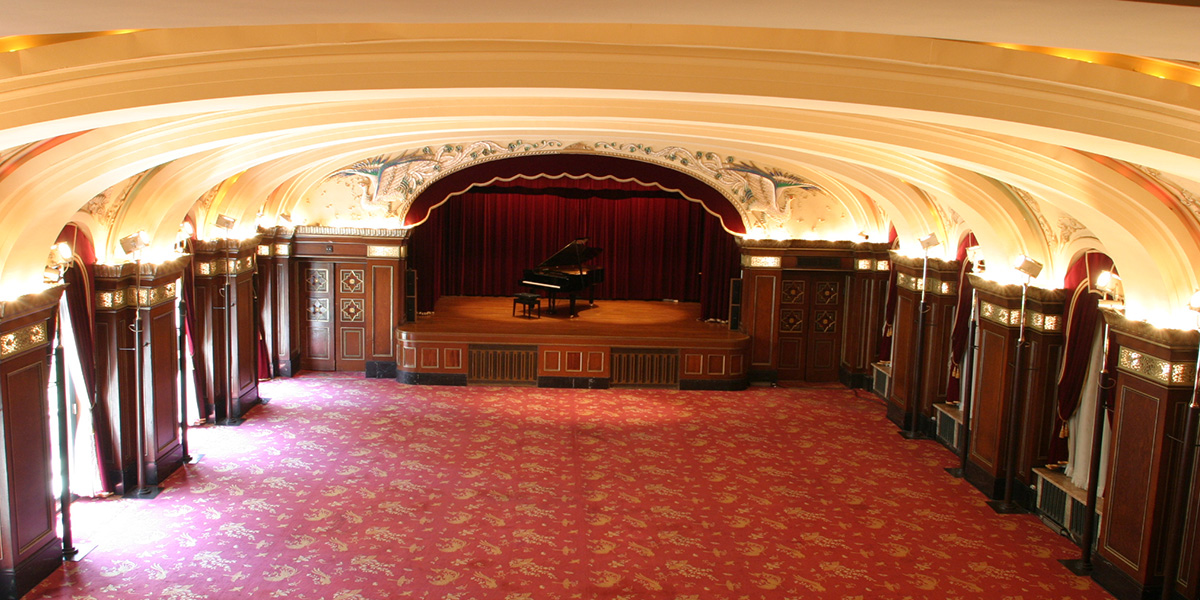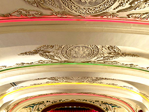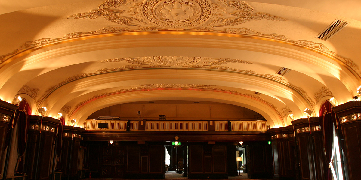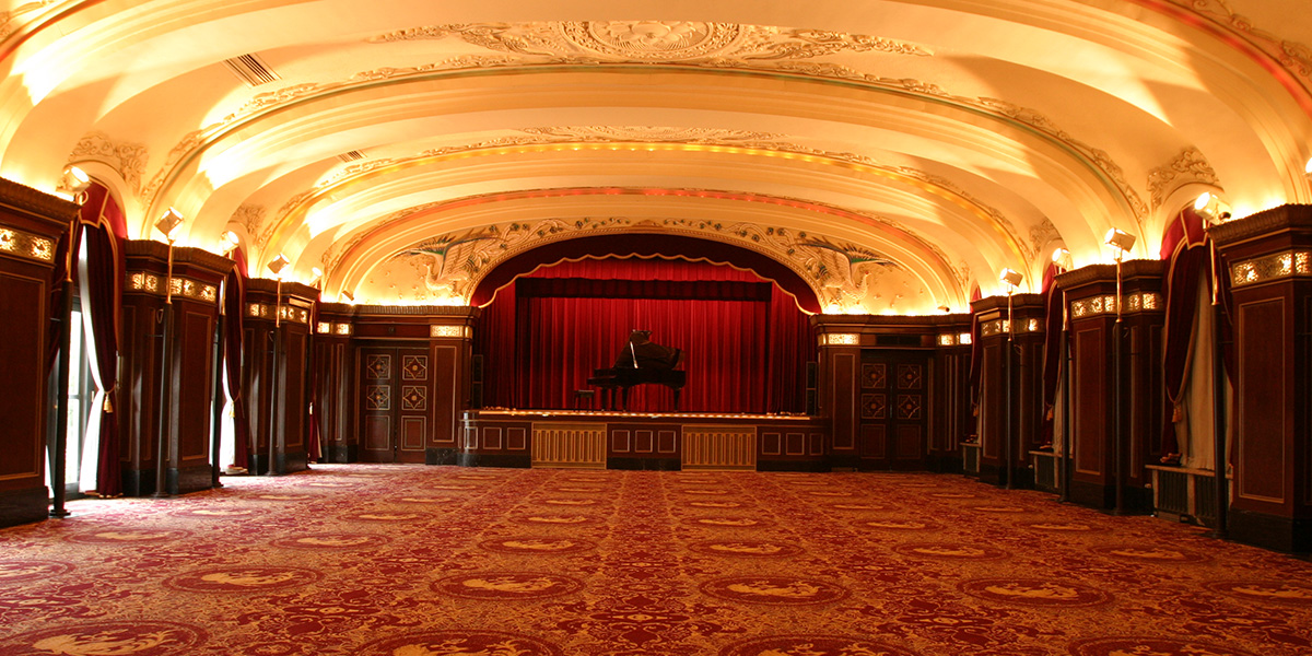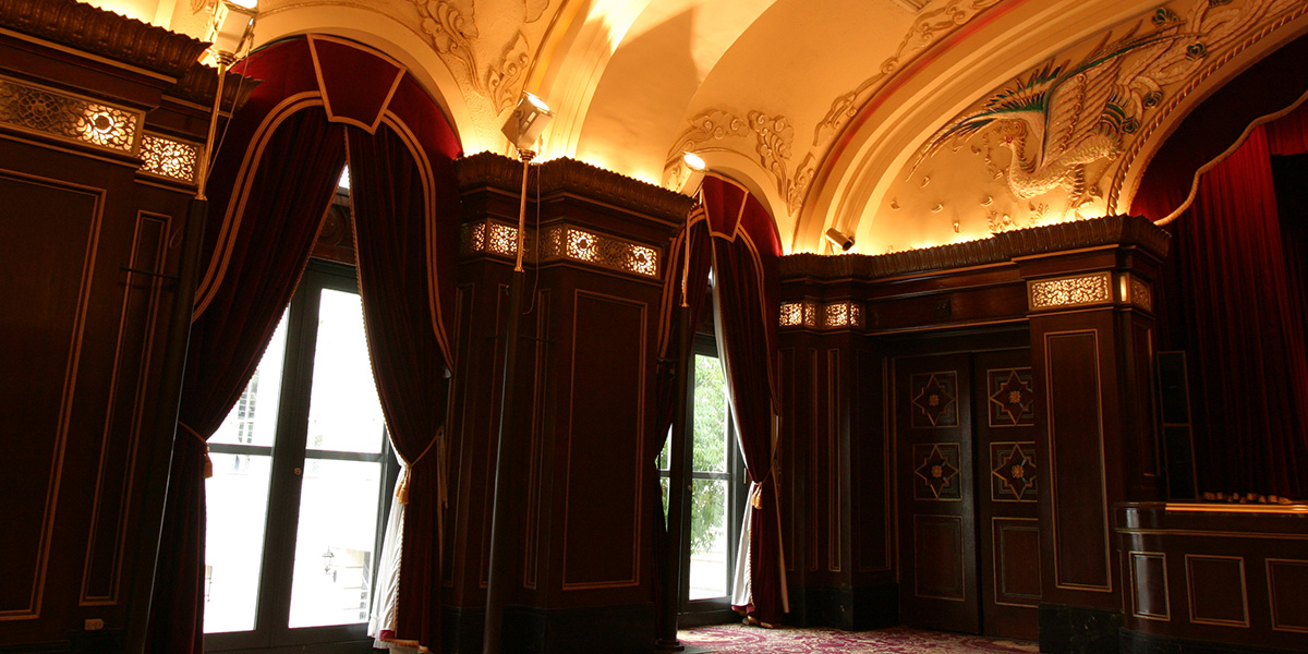 開業当時の面影を今日に伝えるかのように、重厚な柱や天井に彫られた豪華絢爛な彫刻、深紅を基調とした色合いがヨーロッパの薫り漂う格調高い世界へと誘います。