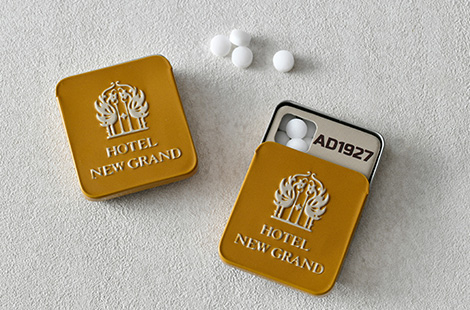 当ホテルのルームキーに付いている真鍮製のキーホルダーを模したパッケージが印象的なミントタブレット。