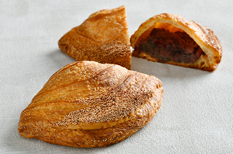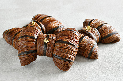 外はサクサク、中はもちもちの生地になるようクロワッサン生地を幾重にも折り重ねて焼き上げ、甘さ控えめなガナッシュをたっぷり詰めました。